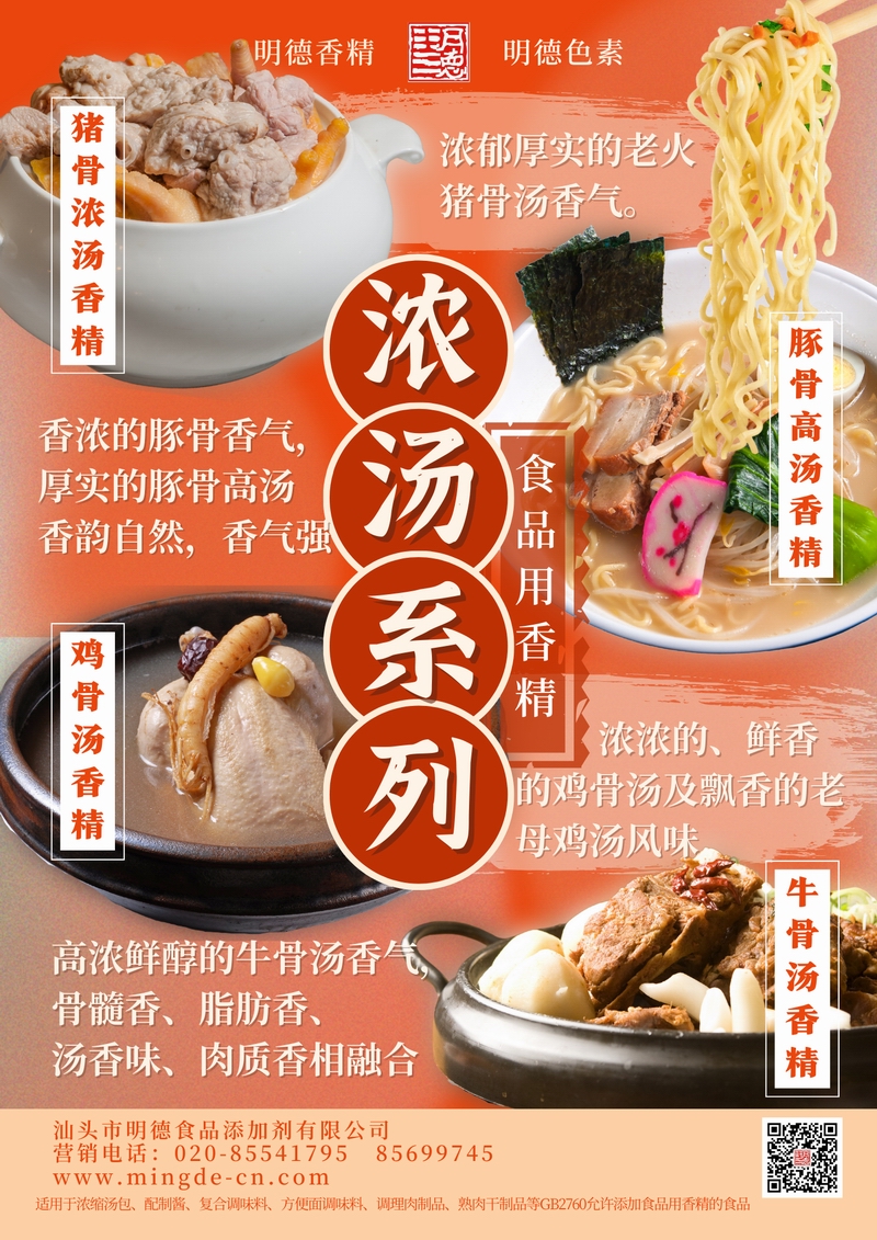 明德濃湯風味系列香精 骨湯真韻 湯感醇厚汕頭市明德食品添加劑有限公司推出的濃湯系列香精,涵蓋豬骨濃湯、豚骨高湯、雞骨湯、牛骨湯等多種調(diào)性。產(chǎn)品真實還原老火熬煮的骨香與湯感層次,香氣厚實,留香穩(wěn)定。適用于調(diào)味料、復合調(diào)味料、濃縮湯包、方便面湯包、調(diào)理食品及肉制品等B端應(yīng)用,幫助工廠快速打造統(tǒng)一、標準化的骨湯風味。